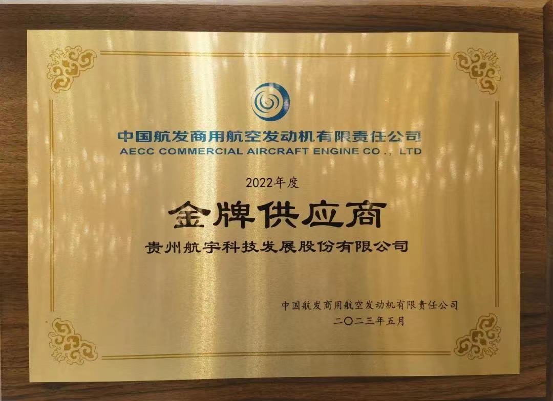 航宇科技榮獲中國航發商發“2022年度金牌供應商”榮譽稱號